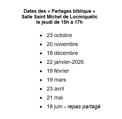 « Partage Biblique » avec soeur Gracia, salle St Michel de Locmiquélic, les jeudis de 15h à 17h