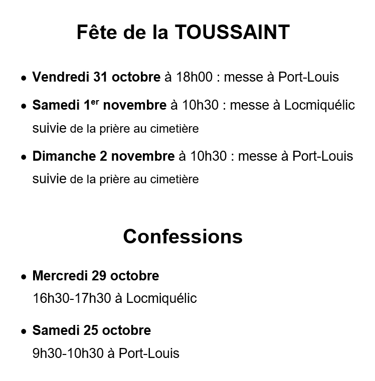 Samedi | 25 Oct. | Port-Louis à 9h, confessions et adoration de 9h30 à 10h30